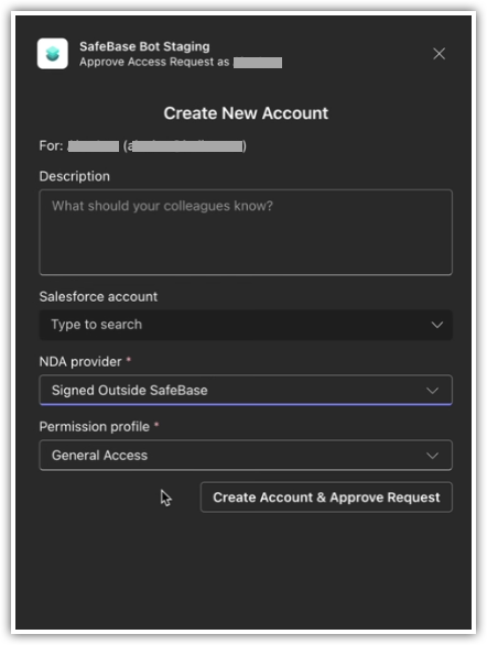 Previously, Microsoft Teams approvals only worked for existing accounts, requiring users to switch to the SafeBase app to complete requests for new accounts, an extra step that created friction. You can now create new user accounts when approving access requests directly in Microsoft Teams.