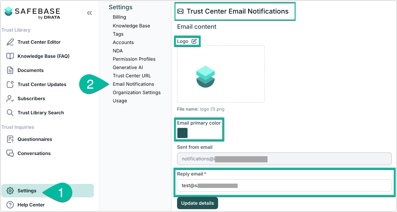 Customers can now update their Email Notification Settings, including email branding and reply-to email fields, directly in the SafeBase app, even after initial setup. Previously, these settings could only be configured once, and any future changes required contacting Support. Now, customers have full control to both set up and modify these settings on their own.